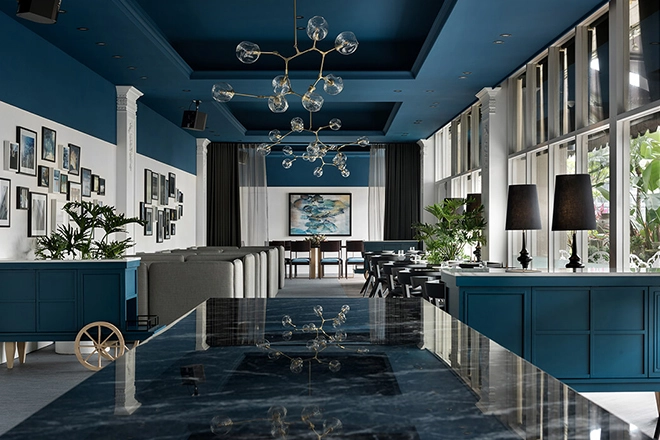 為了獲得如繪畫般的空間效果,融合現代與古典的細節,以大面積的湖水藍為背景,刻意將濃厚的色調安排在天花板,上重下輕的安排呈現與以往不同的空間經驗,藉著純粹的背景將干擾視覺的線條抹除,點綴金銅色的配件及燈飾,讓視覺更加鮮明。