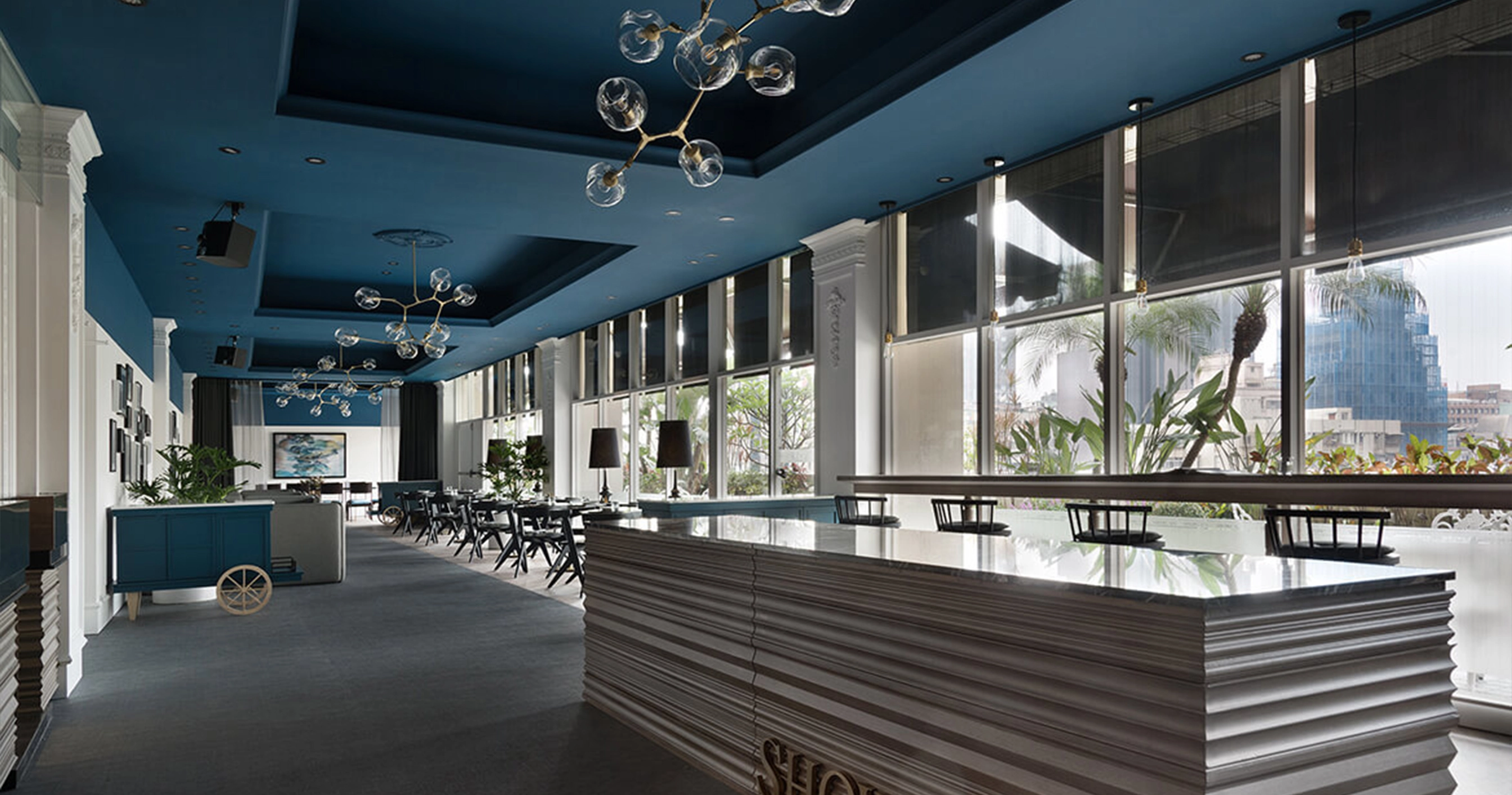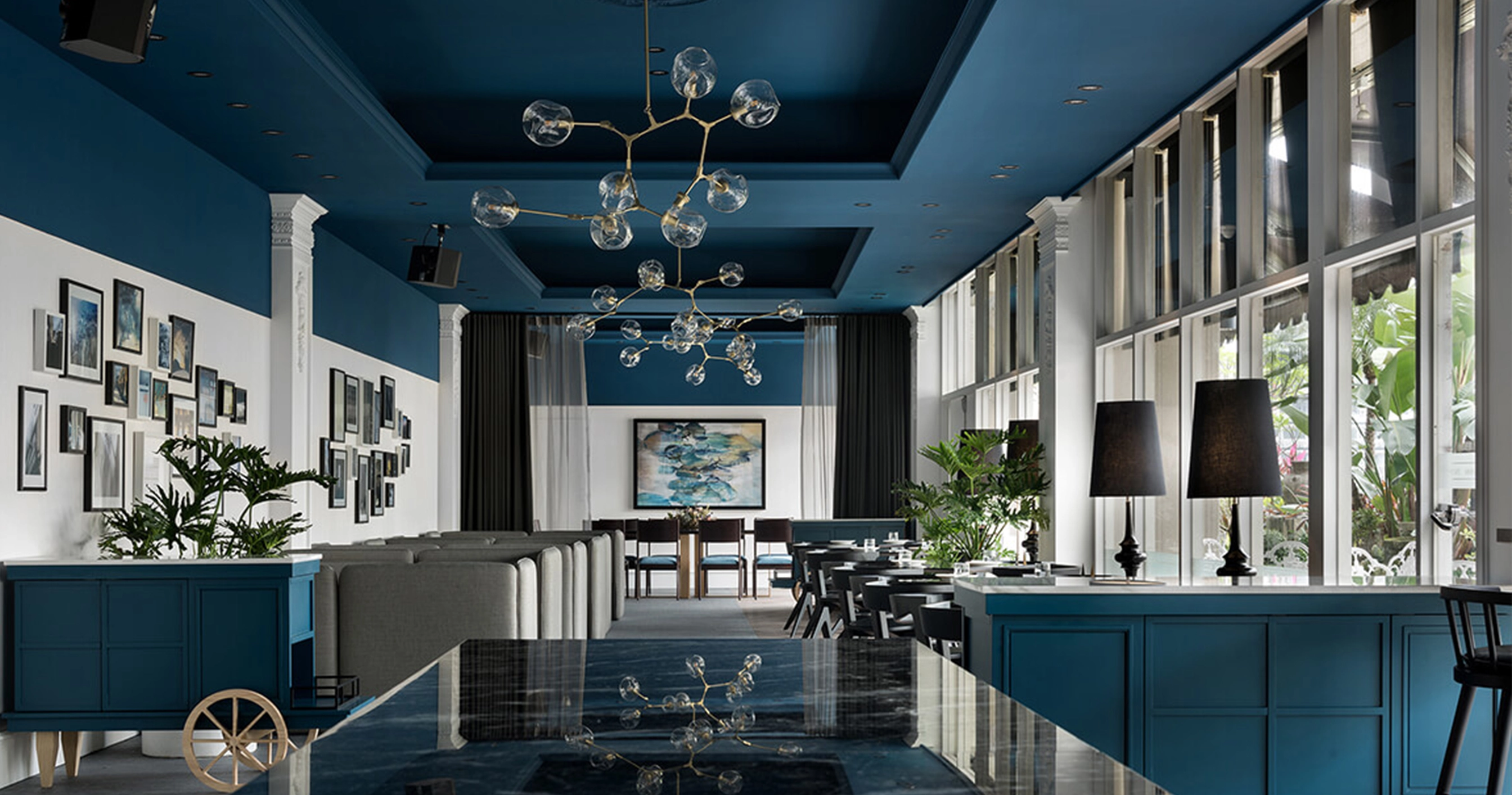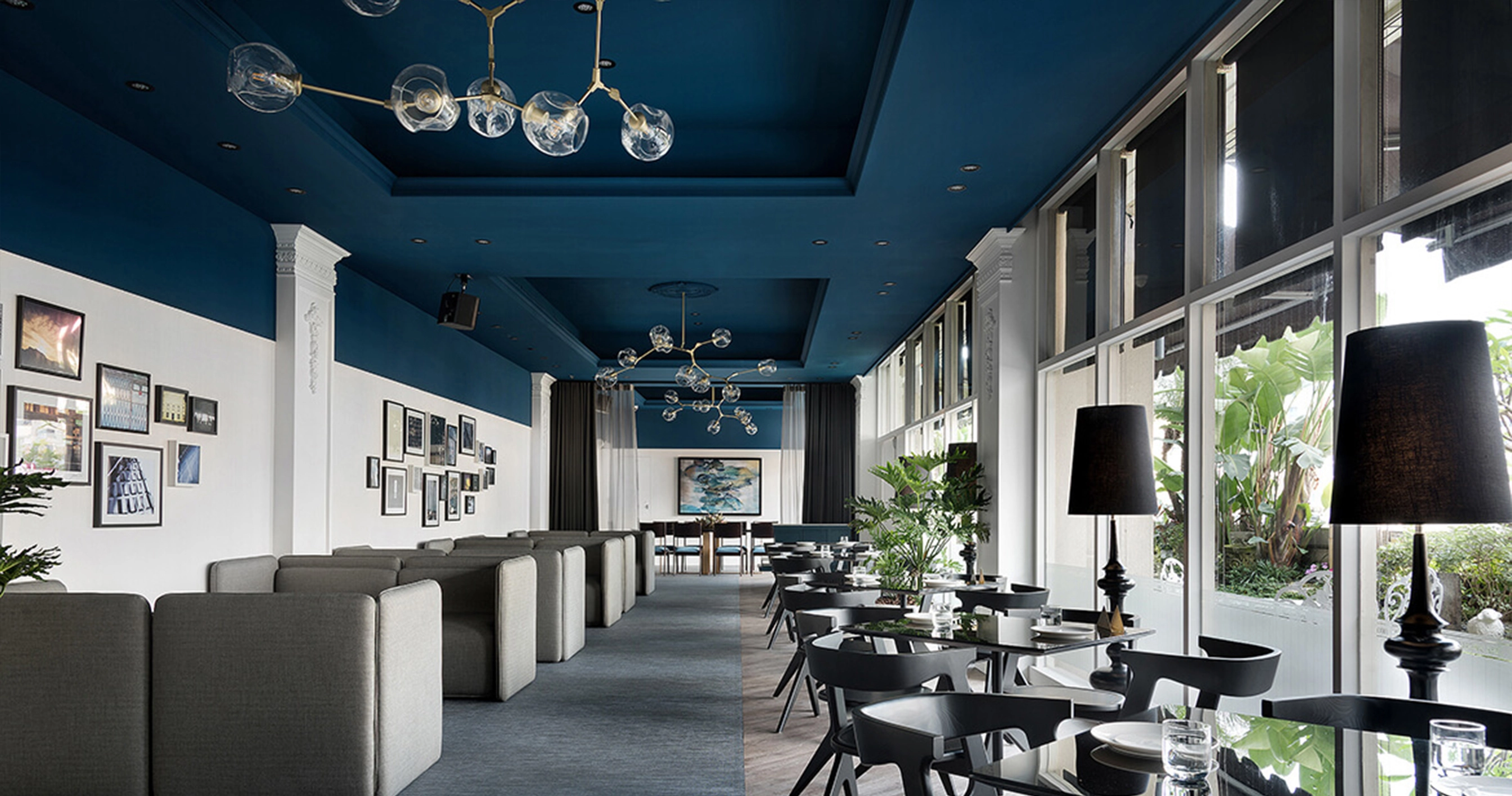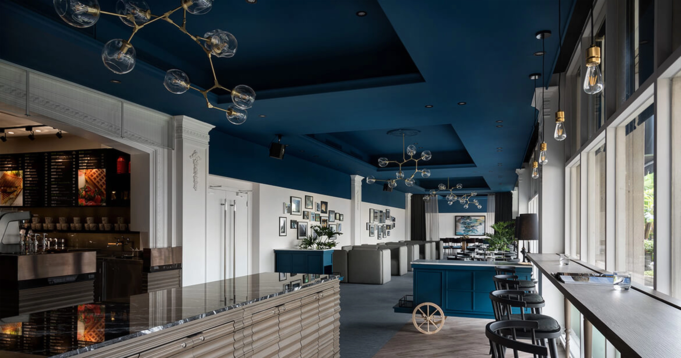 SHOWTIME Cinemas and its related business, SHOW CAFÉ flagship store, are located in Taipei Zhongshan District. In an effort to create a painting-like effect for the use of the space, we use the color of “lake-blue” as background and deliberately arrange the strong color across the entire ceiling. This technique gives us an unconventional way of experiencing the space. Furthermore, by using a pure and solid color, we erase the use of lines that tend to cause a visual disturbance. The ceiling-to- floor windows allow the scenery of greens to be evenly distributed in every corner of the space, strengthening the depth of the space and polarizing the elegancy of the classical details of the interior vividly.