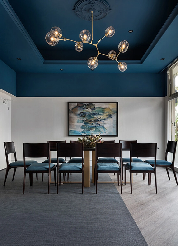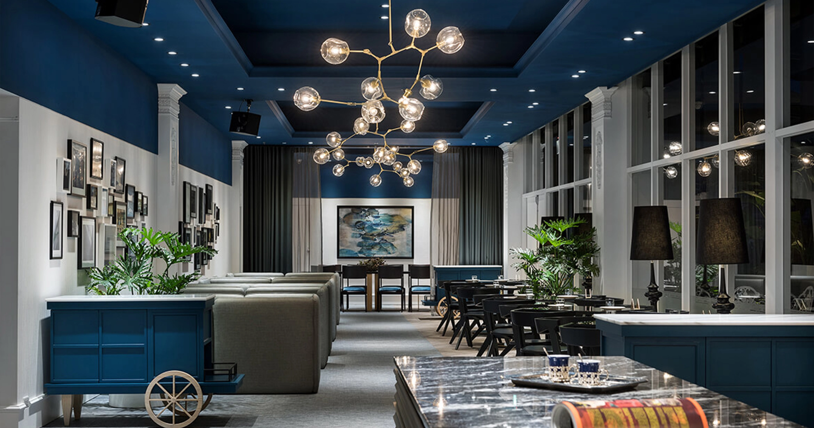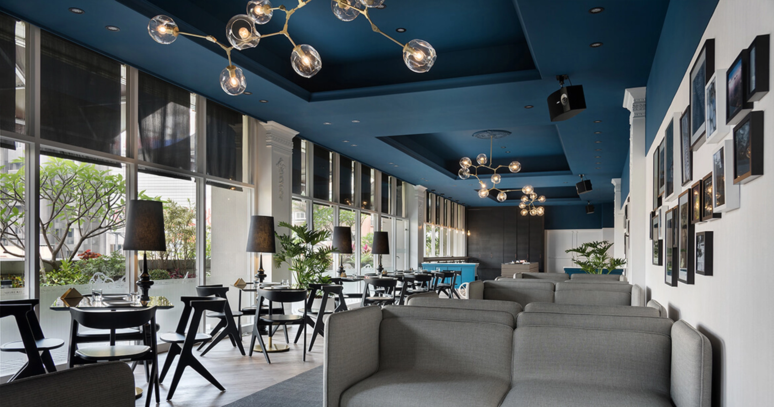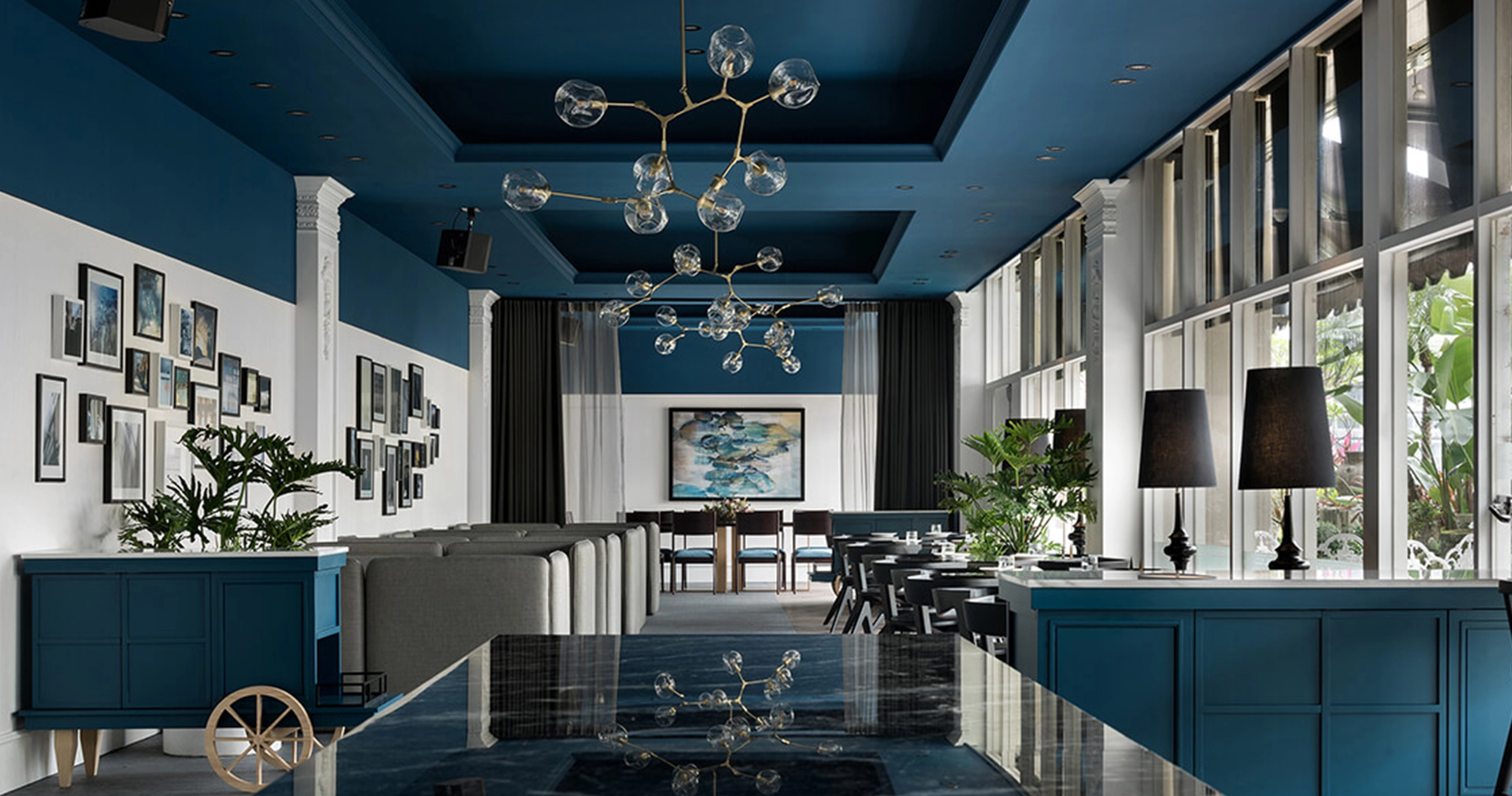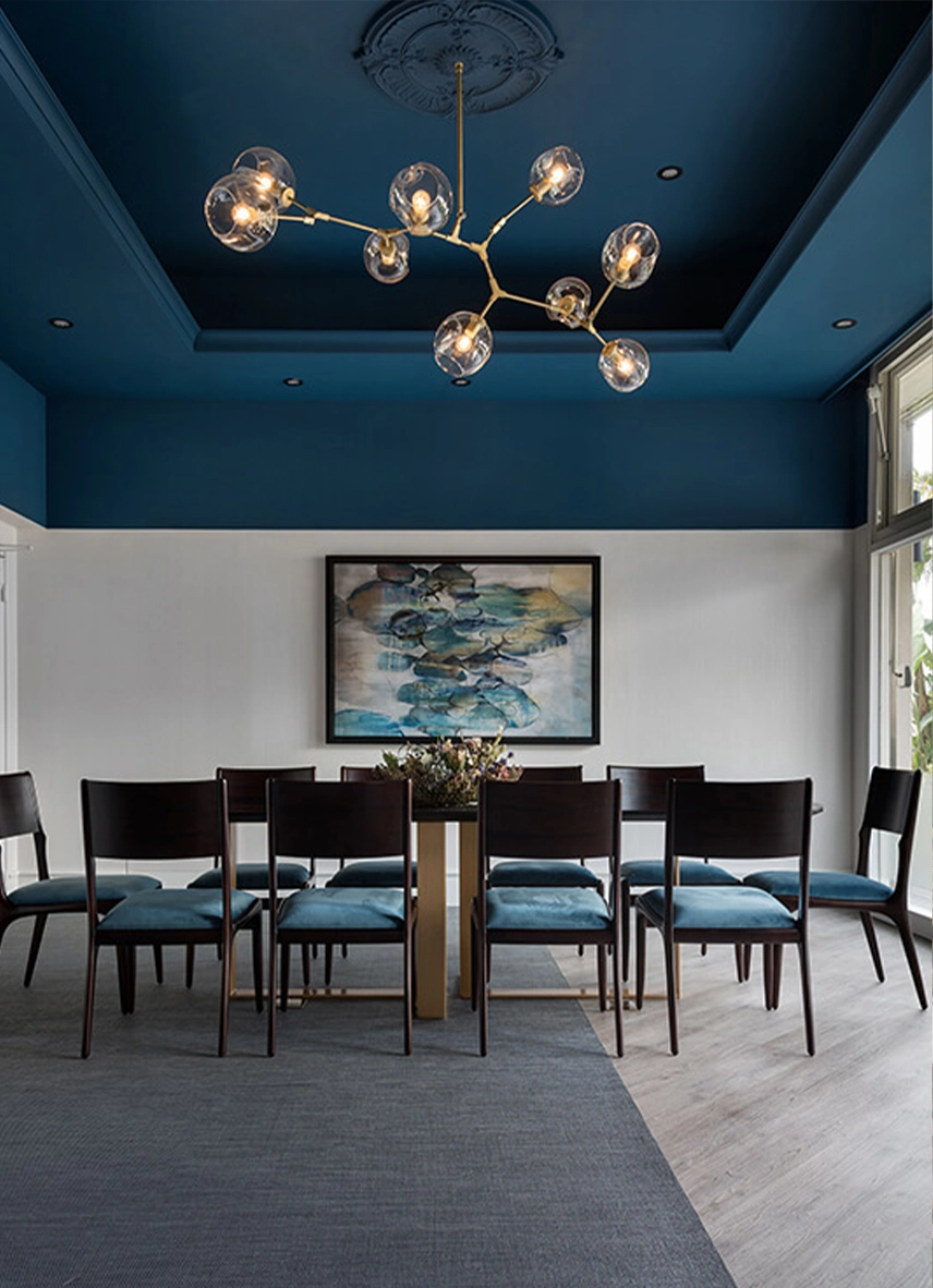 SHOWTIME Cinemas and its related business, SHOW CAFÉ flagship store, are located in Taipei Zhongshan District. In an effort to create a painting-like effect for the use of the space, we use the color of “lake-blue” as background and deliberately arrange the strong color across the entire ceiling. This technique gives us an unconventional way of experiencing the space. Furthermore, by using a pure and solid color, we erase the use of lines that tend to cause a visual disturbance. The ceiling-to- floor windows allow the scenery of greens to be evenly distributed in every corner of the space, strengthening the depth of the space and polarizing the elegancy of the classical details of the interior vividly.
