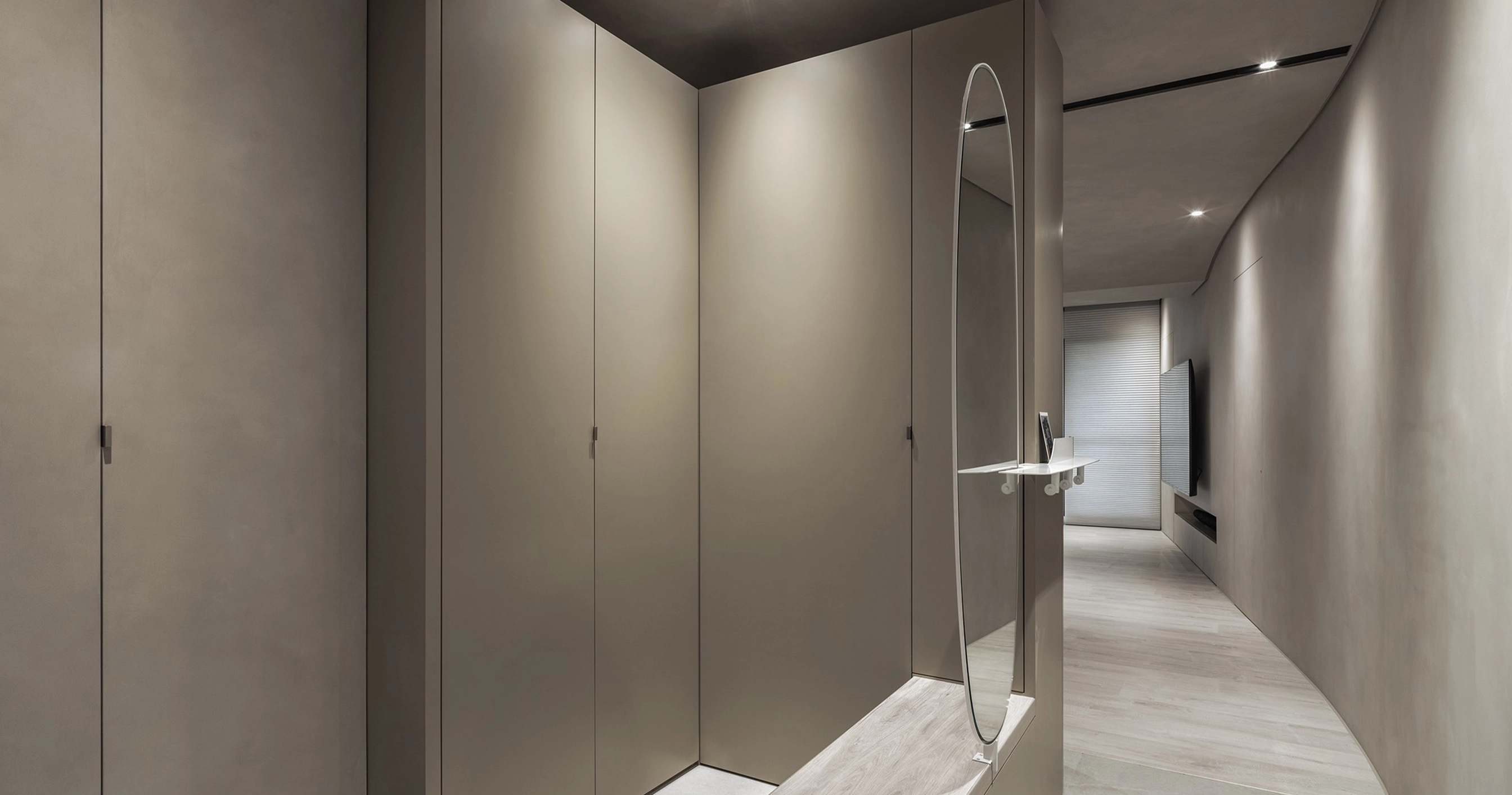 The house owner has all kinds of big and small suitcases and props when he leads a tour to travel around. These personal belongings take up quite obvious volume. He hopes to put the working items back in place as soon as he gets home. Considering the lights and the air existing in the space, we plan a storage area to meet the needs of the function and the other one is disassembled to be the dust area set in the middle of the entrance. We use several different building volume of scales, using function and reflective materials to redefine the space.