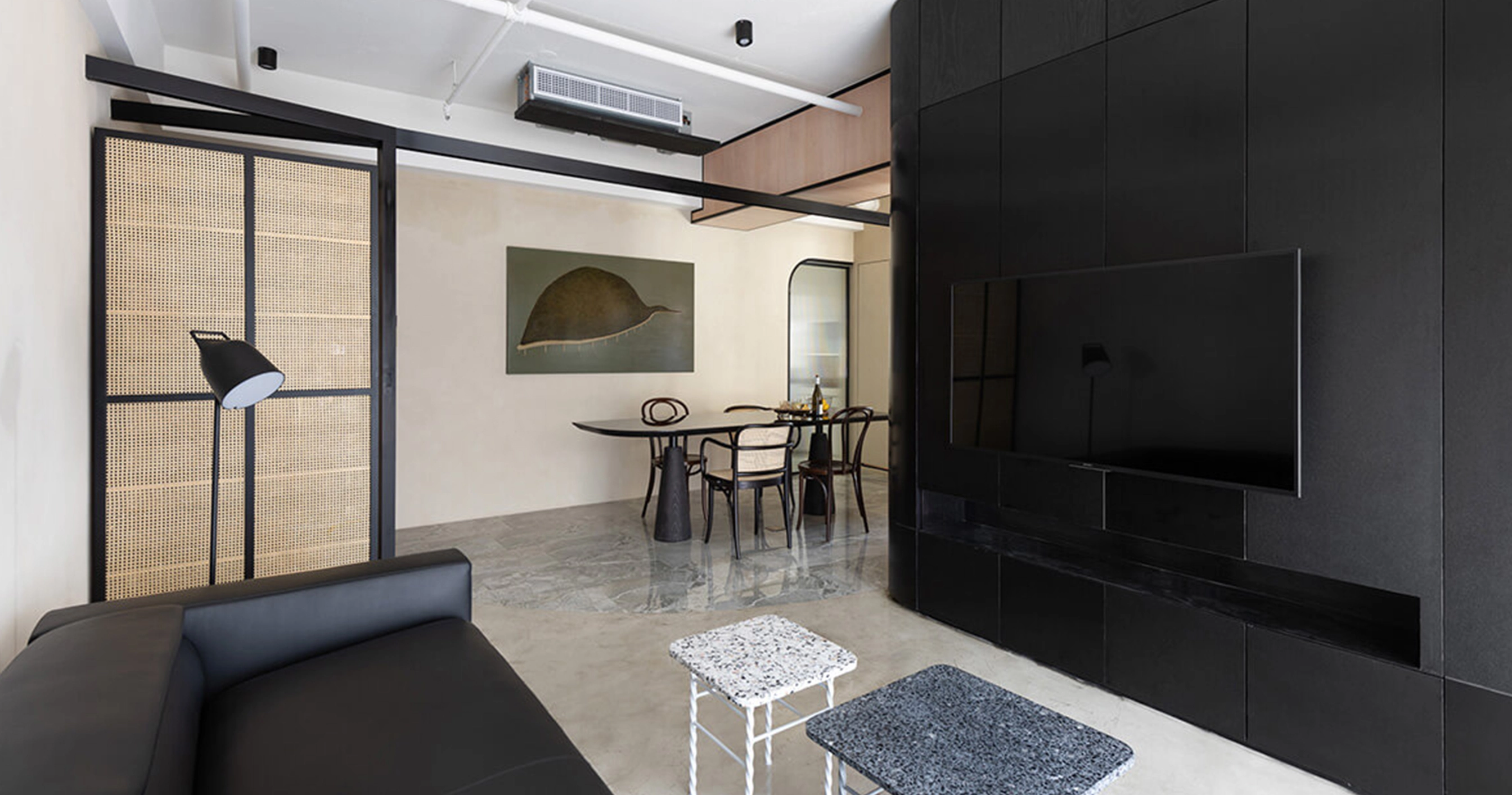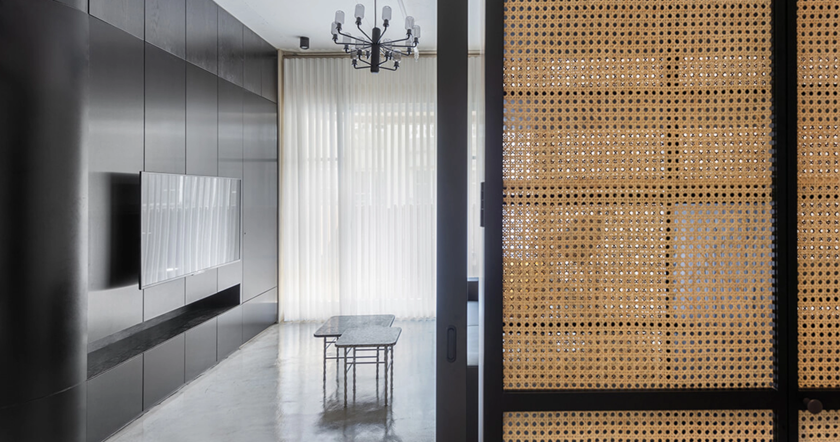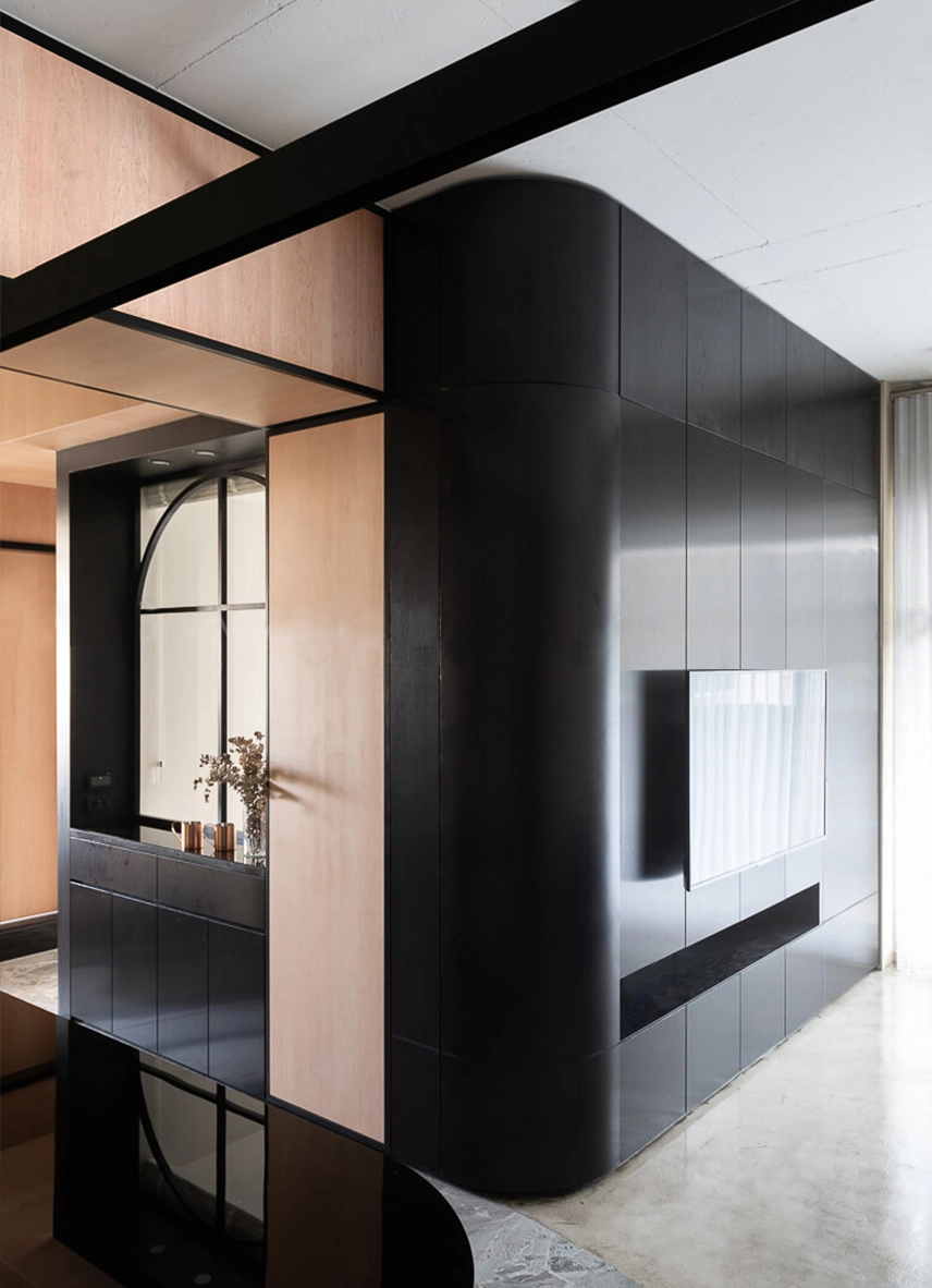 空間以玄關落塵區為界,使用者有兩動線選擇,分別通往餐廚空間及起居空間;Y字形框架穿梭在空間中,扮演著界定區域、室內光源及隱藏式掛物的設計巧思,半開放式的玄關,使用竹編作為雙面通風的置物鞋櫃,利用材料的特性營造出私密卻不封閉的起居空間。