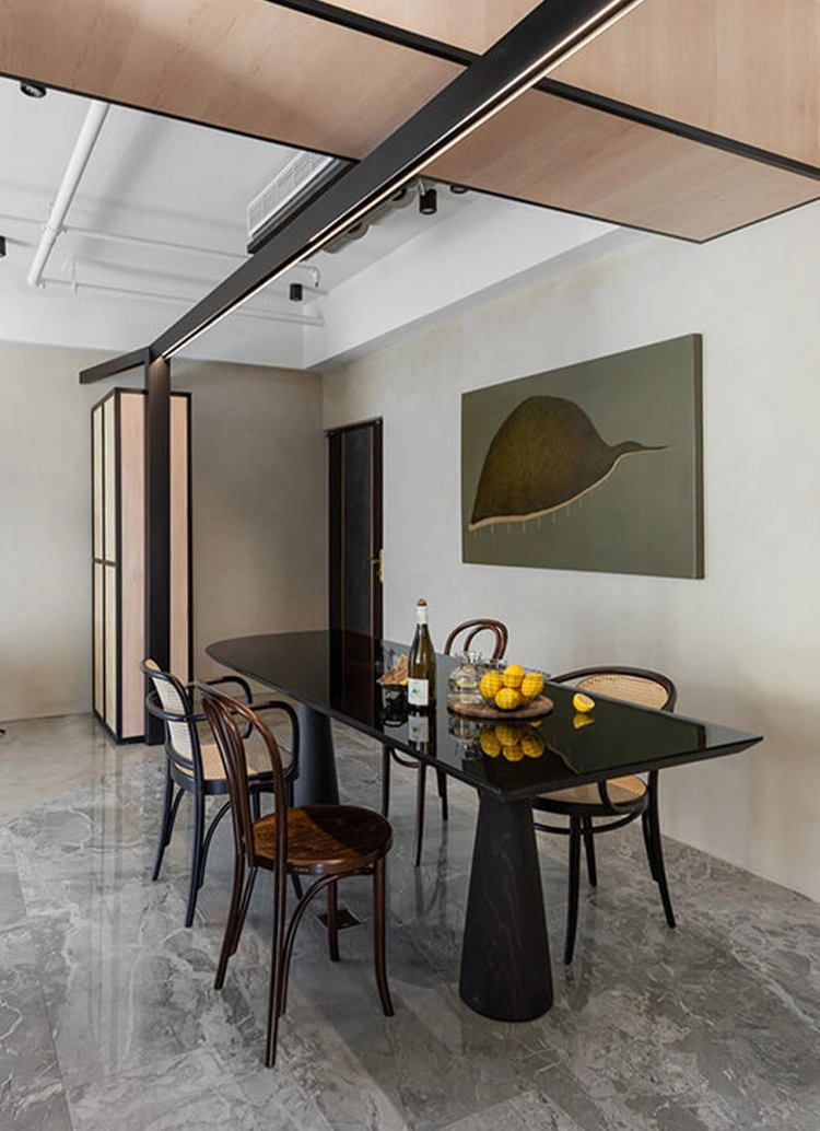 20坪的住宅容納了三房兩廳兩衛的需求,空間資源珍貴,每個區域都須妥善規劃,讓使用者在身體尺度上仍能保有舒適感,並讓餐廳做為空間中的核心,連結每一個角落,減少走道的同時更強化不同空間之間的關係,更透過「光線再利用」的設計,將書房的光線被引導入內,於是Y字形的配置讓空間緊密且寬敞,亦能根據家庭成員的變動,調整空間的使用方式。